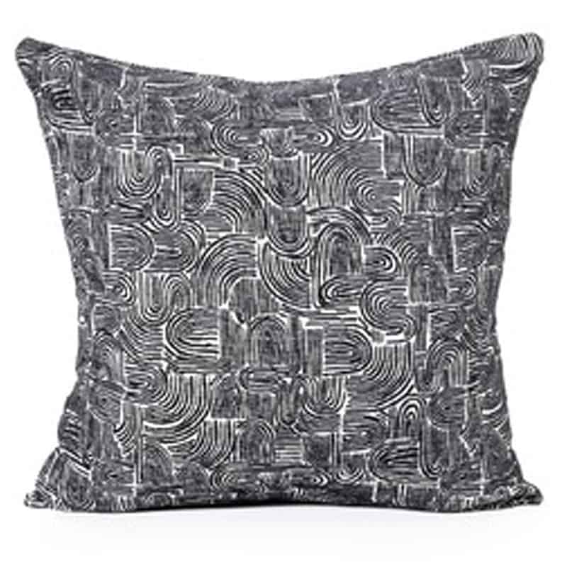A charcoal swirl pattern woven onto a wheat-coloured linen base.